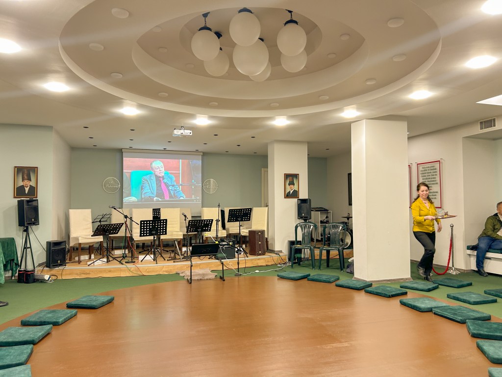 When we arrived, I didn’t know what exactly to expect. The program for the night stated that we could arrive at 19:30 to watch a video discussion about the Mevlevi path so we did. Once we found the location, we went down the set of stairs and took off our shoes. We provided the woman at the desk our names and reservation number and she led us to our seats. We were given a pamphlet and an informative paper that explained a bit more about the Mevlevi order and the ceremony that would take place.
