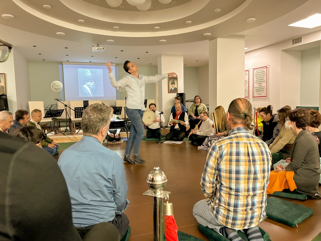 Around 21:00, there is a Mevlevi dhikr, or remembrance of God. In this portion, all of the participants in the room moved to the wooden floor and made a circle on the floor. Everyone sat on their knees on padded cushions. There was someone who read/sang, a flute and hand drum, and some chanting by all of the participants. Near the end someone even got up and started spinning. At this point everyone is participating in some way and they’re all in regular clothing.