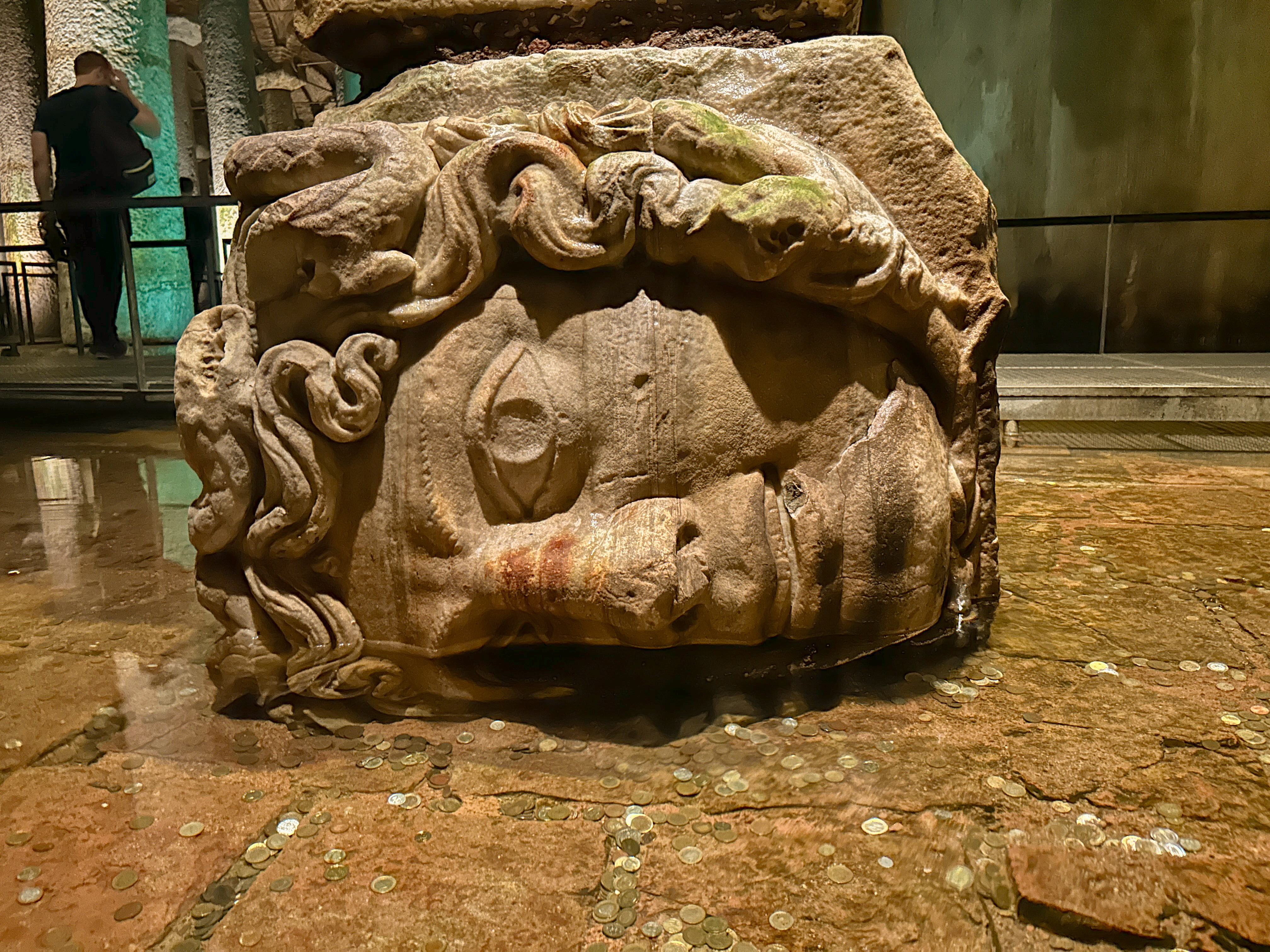 The Basilica Cistern is a large underground chamber that historically provided Constantinople with water. It was built by emperor Justinian in 532 and is the largest ancient cistern in the city. The cistern is supported by 336 columns and features interesting carvings such as a medusa head underneath one of the columns. Today the cistern has only a small amount of water underneath the walkways. There are multicolored lights the color the giant room as well as some modern art sculptures.