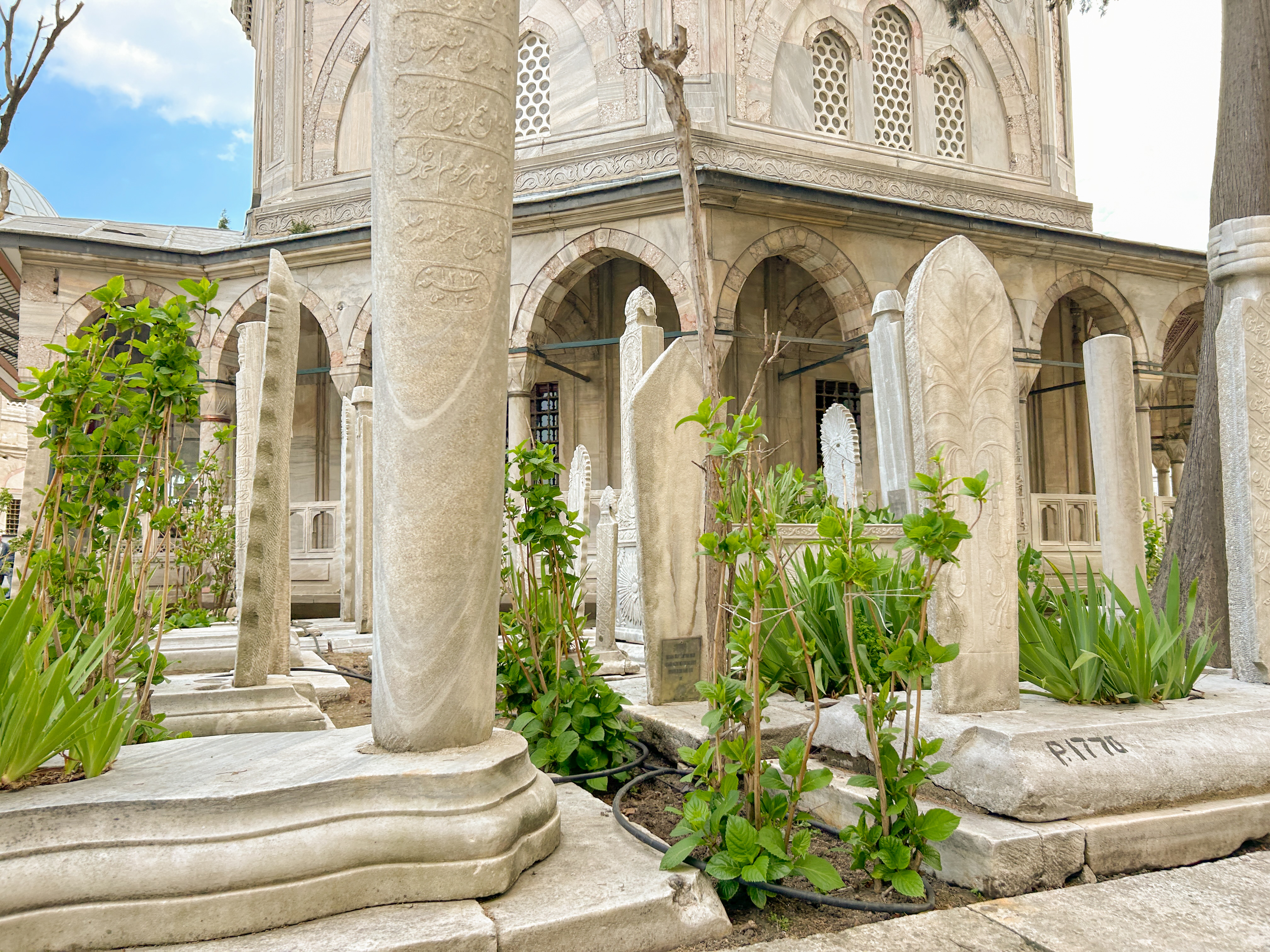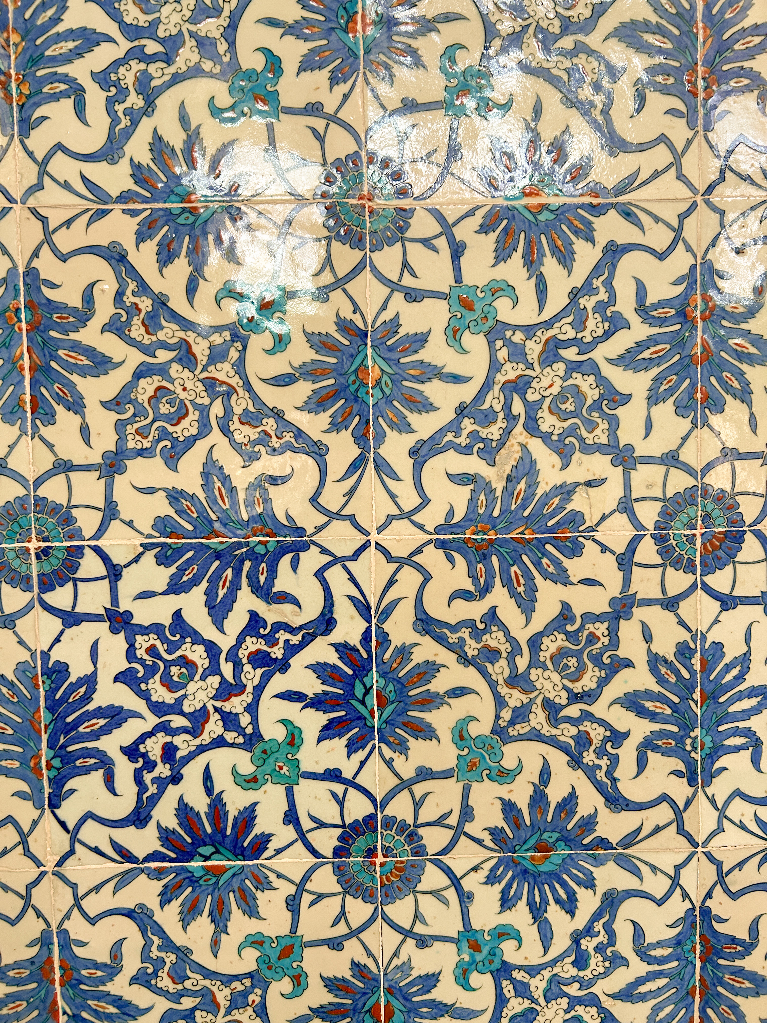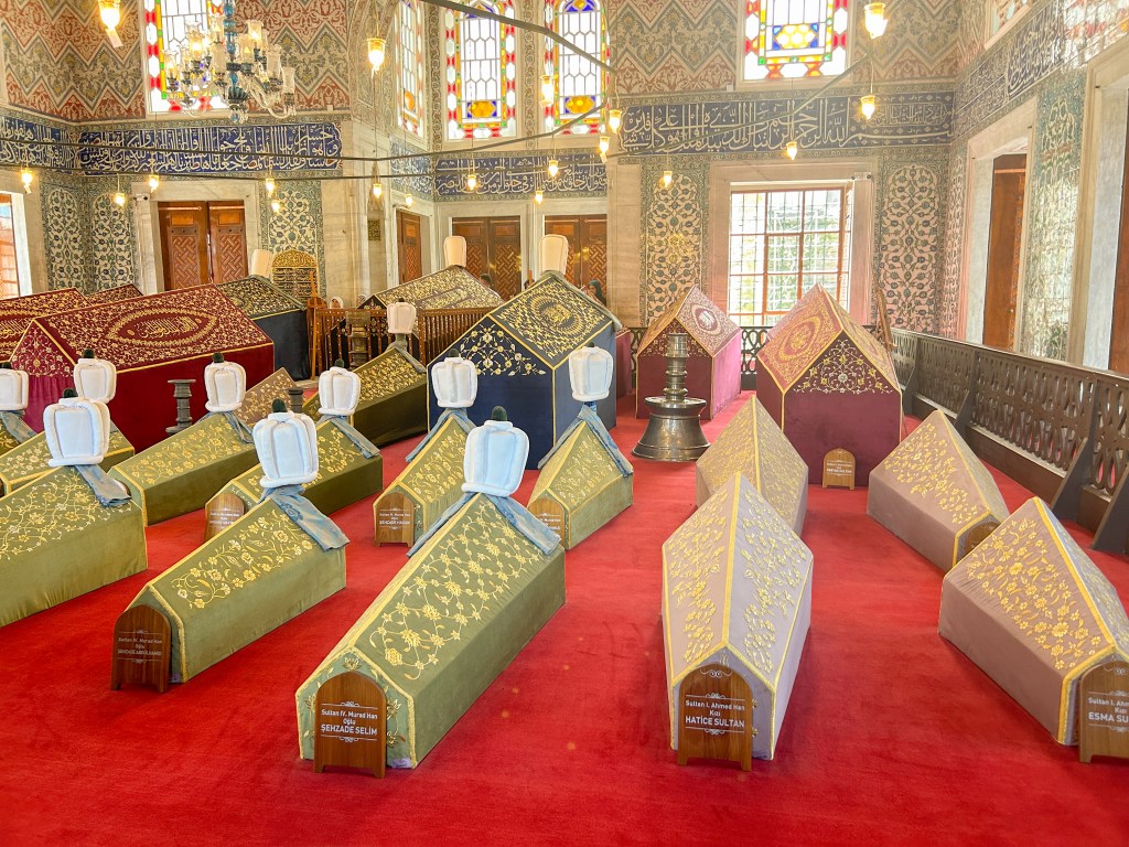 A short walk outside of the blue mosque is a türbesi, or tomb, that houses Sultan Ahmed I himself along with two other Ottoman sultans. If you’ve never been inside the resting place of a sultan, let me tell you, it’s one of a kind. Inside are velvet covered sarcophagi decorated with ornate designs. The walls are covered in colorful Iznik tiles that you can see in detail up close. I personally enjoyed this tomb more than the blue mosque itself. I’d never seen anything like it before and I loved seeing all the beautiful tiles.