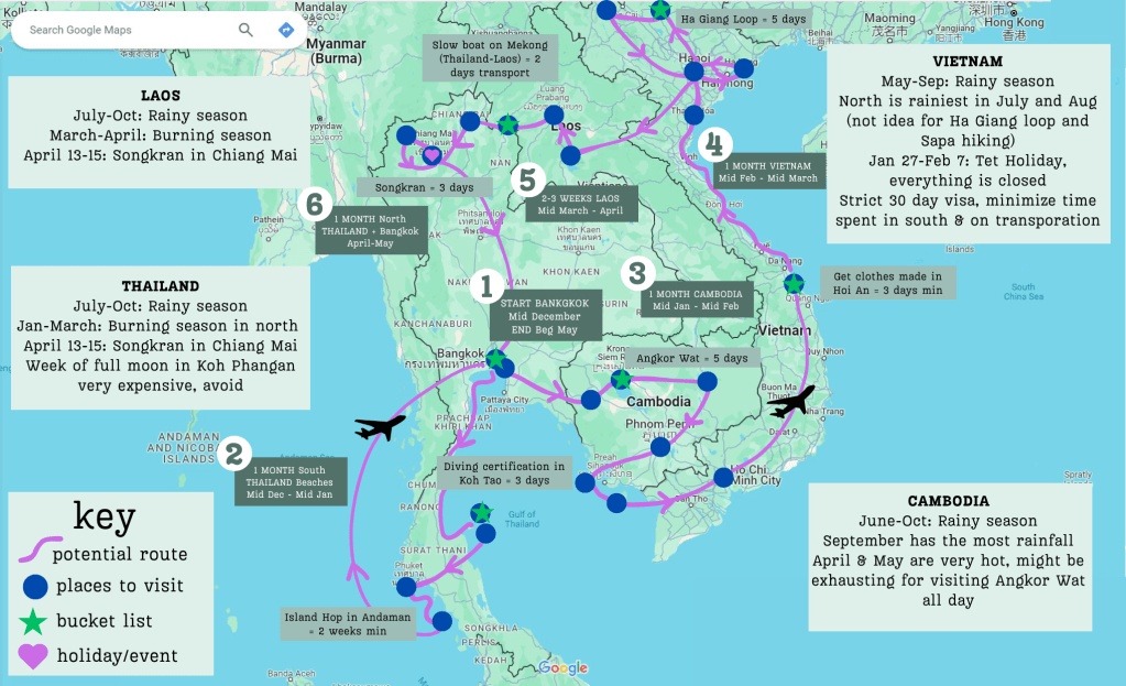 Below I’ve put an example of a 4-5 month sample route for visiting a portion of Southeast Asia. You can use the steps listed above to do something similar. With this route, I have an idea of where I want to go, when, and for how long. I’ve made sure to try and avoid the rainy season in most locations while still being able to visit Chiang Mai for Songkran celebrations and avoid Vietnam during the Tet holiday. I also make sure that I incorporated my bucket list activities and places into my route. Lastly, I made note of where I anticipate taking a flight instead of a bus or train.