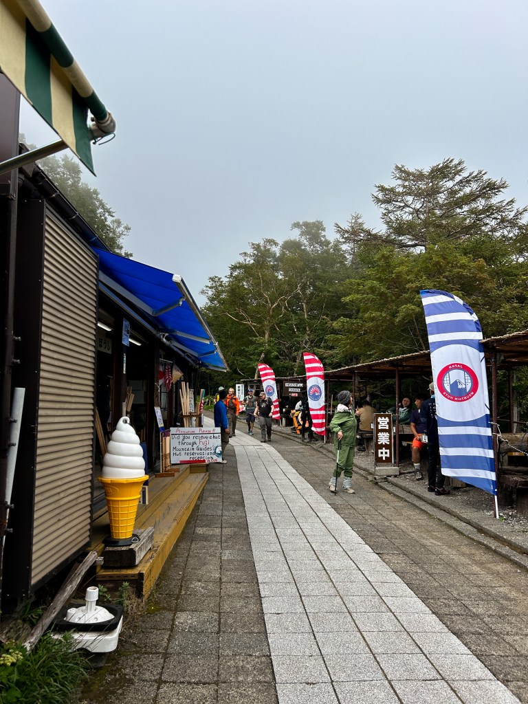 Once the shuttle dropped us off the weather was already noticeably colder. I actually started off wearing a pair of shorts and a long sleeve shirt; however, I decided to change into my hiking pants at this point due to the colder temperature. At the fifth station, there is a bathroom, a restaurant, a shop, and some vending machines. Here you can order a meal, from a very large menu with Mount Fuji themed foods, and sit outside at one of the many wooden benches.