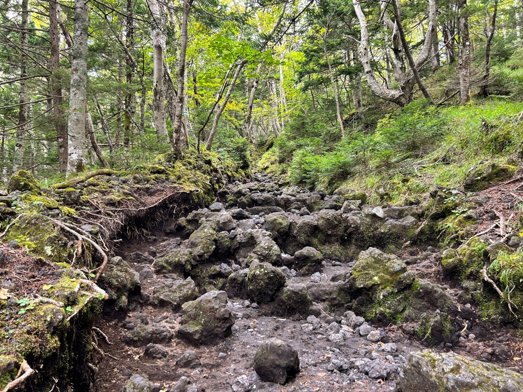 The beginning of the Subashiri trail is covered in lush green forest. The starting altitude is about 2,000 meters and you can’t even see where you’re going (the top of the mountain) from here. The trail is pretty rocky and wet, which can also be slippery. I didn’t see any animals, but I saw plenty of insects and little mushrooms. The trail went on like this for a surprisingly long time, about an hour of dense forest, before starting to thin out. I was expecting it to be volcanic and barren the majority of the climb so this was a pleasant surprise. The weather was perfect in this section and there was lots of shade from the sun. We barely saw anyone on this trail, which was also a huge surprise.