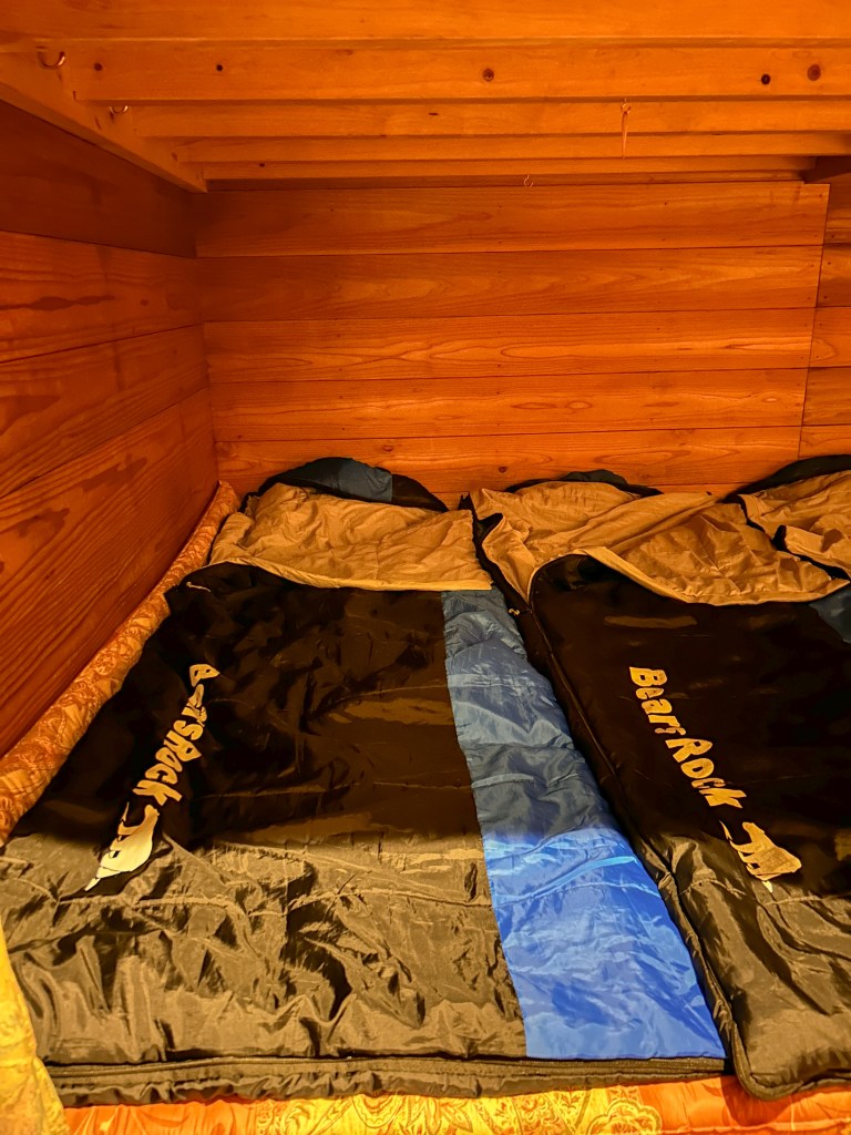 The sleeping bags are lined right up next to each other to maximize space. So don’t expect much privacy. There are some hooks here and there that you can hang a jacket or other items from, but it depends a lot on where you’re located in the long line of sleeping bags. There are curtains on the bottom entrance to the sleeping areas to keep it dark and lights of the sleeping area are turned off at 20:00.