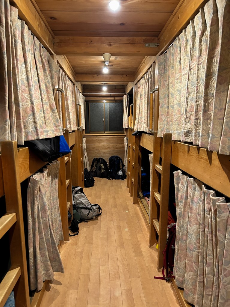 After this exhausting section of the climb, we finally made it to our mountain hut. We stayed at the Miharashikan Mountain hut. Upon arrival, we went to the check in area through a sliding door. It was pretty hectic once we got inside. The entrance section, where you can wear your outside shoes, is very small. The way that the door is setup, me and my brother were blocking the entire entrance while trying to check in. Since I booked online in advance, I gave the worker my name. She very quickly explained to me where the bathroom was and had me mark what type of breakfast I’d be having (sit down or to-go). At the same time this was happening, another worker to our left, on the elevated no shoes area, was asking us for our hiking poles. She was also trying trying to get us to take off our hiking boots and go up to the no shoe area. And to top it off, people were trying to get in and out of the entrance area that I was blocking. It was a bit stressful and unorganized to say the least.