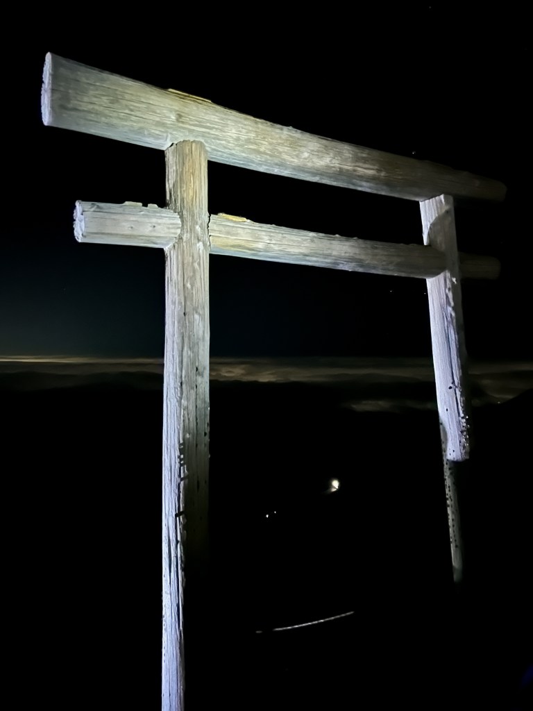 There are a couple of tori gates that you pass under when you get near the summit. And then there is one final tori gate with some komainu statues in front of it. Finally we made it to the top! The sun was just starting to show signs of existence in the form of a narrow strip of sorbet orange and an ombre blue sky. We found a seat and watched the show.