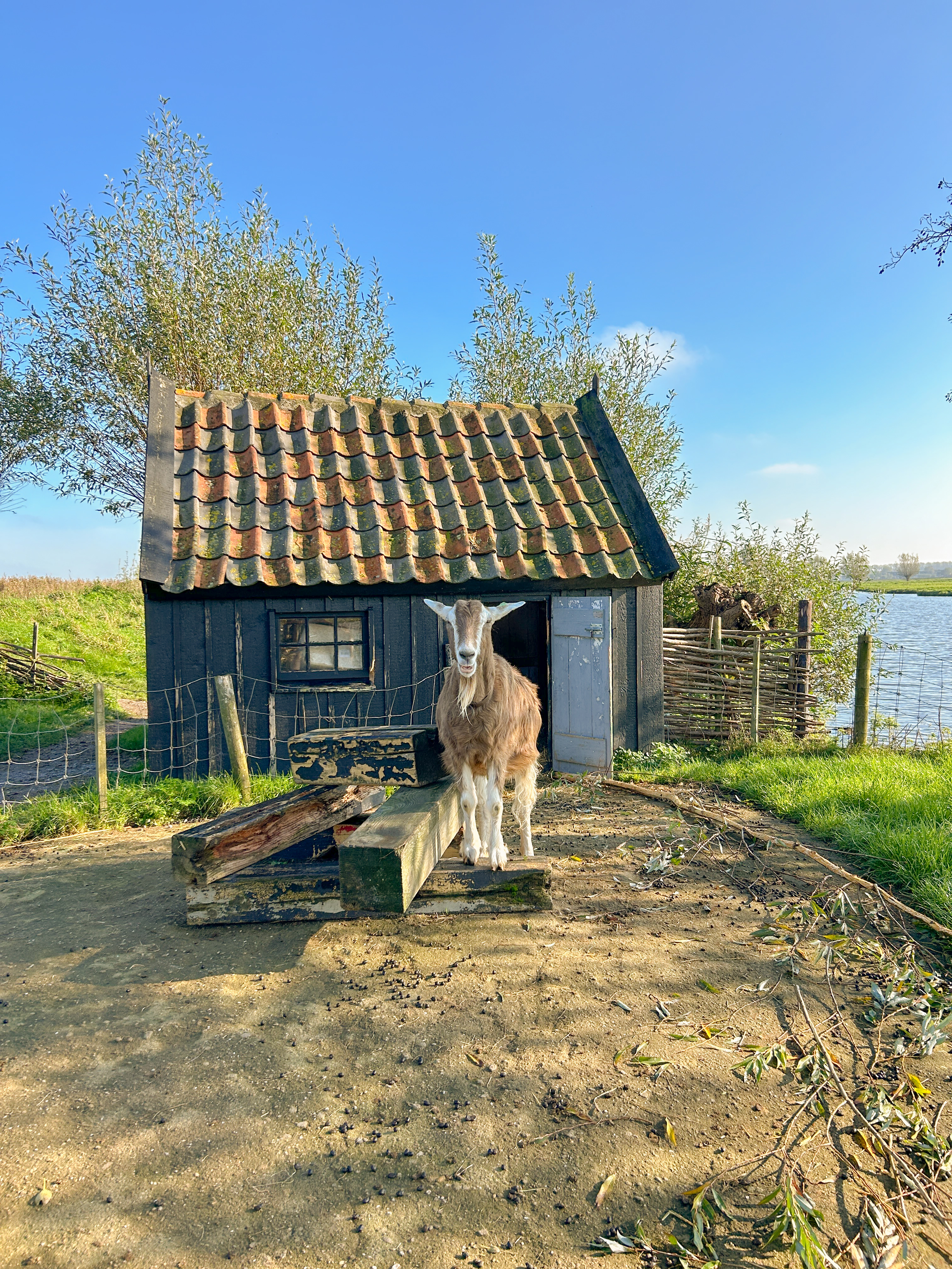 Much farther along the path, you will find the second windmill that you can enter with your Kinderdijk ticket. This windmill originally dated back to 1631. However, in 1997 it was destroyed by a fire and had to be rebuilt in its original form. The exterior is quite different from the other windmills because the scoop wheel on this windmill is actually on the outside, not the inside. Additionally, the interior of this windmill exhibits a more modern design which helps you try to imagine how some of the windmills that are currently inhabited might be used today. There isn’t as much to see on the inside of this windmill as the first one. However, there are a couple of other things in the area including a little farm with some goats and a sailboat exhibit.